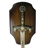 This sword has intricate detail throughout the handle and blade. The handle is produced in two tone antique copper and gold colored metals. The polished stainless steel blade is detailed with the Knight's symbols. The display board has a wood grain finish and two gold colored studs to hang the sword from. Each stud is brass in color.The overall length of the sword is 47 inches.The size of the headstone display is 20 inches high by 12 inches wide. This is a heavy item. The sword weighs about 8 pounds.